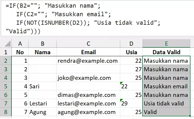 Rumus berikut memastikan bahwa semua data telah diisi dan usia berupa angka. Cocok untuk form input sederhana.