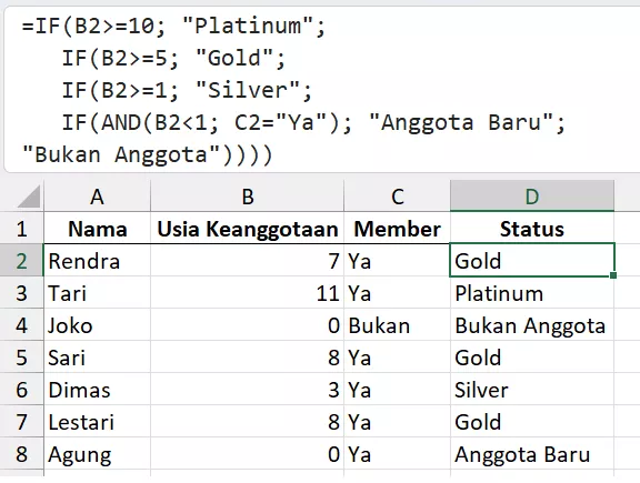 Rumus berikut menentukan status keanggotaan berdasarkan lama bergabung (B2) dan status pendaftaran (C2). Rumus menggunakan AND untuk menangani kondisi gabungan.